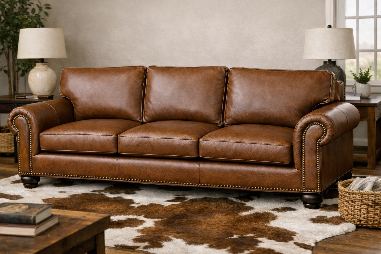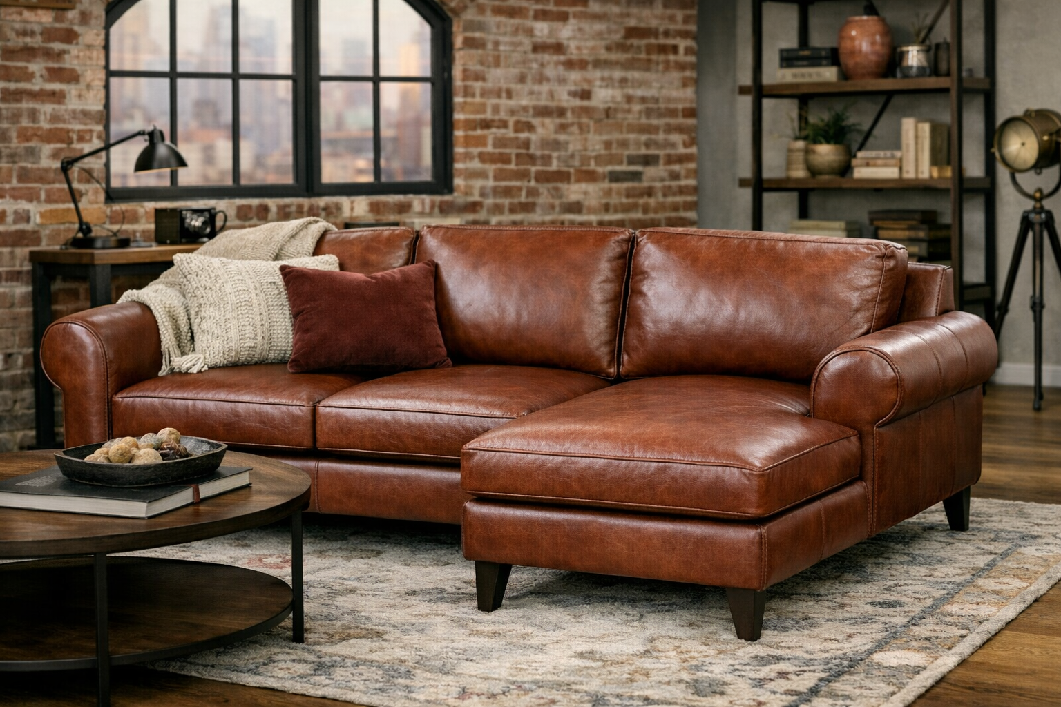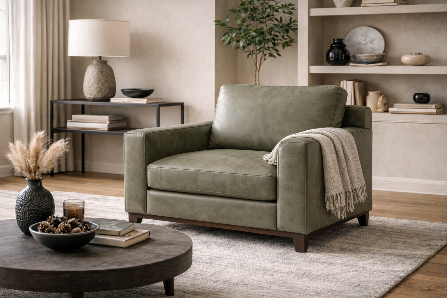 Explore example renderings of leather in use across furniture and interiors. These images are for inspiration only—color and texture may vary by leather line, finish and screen settings. Browse our product lines and color book to find the closest match for your project.