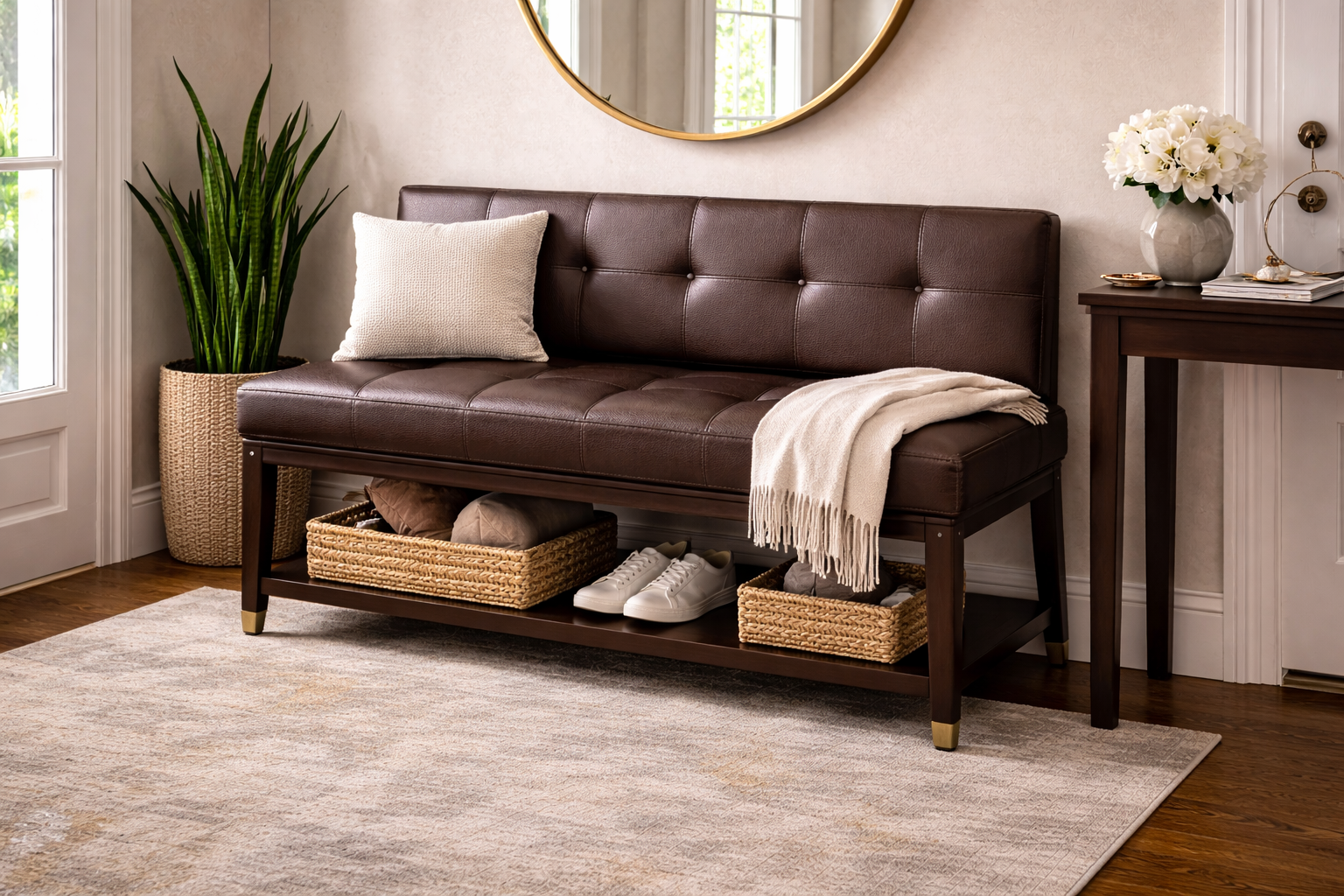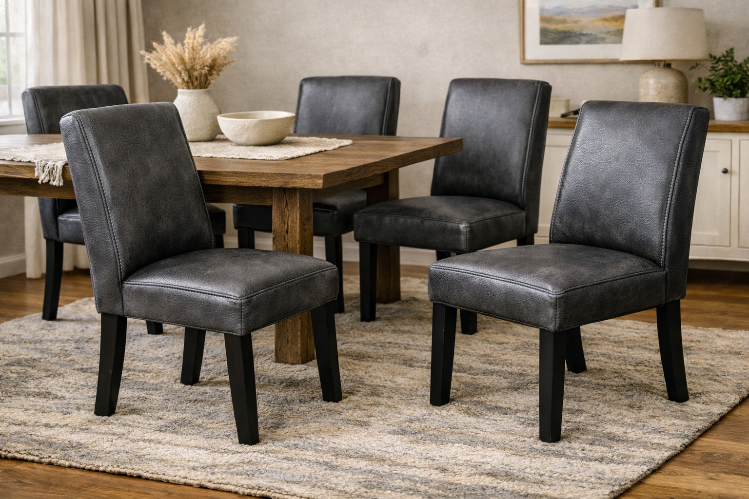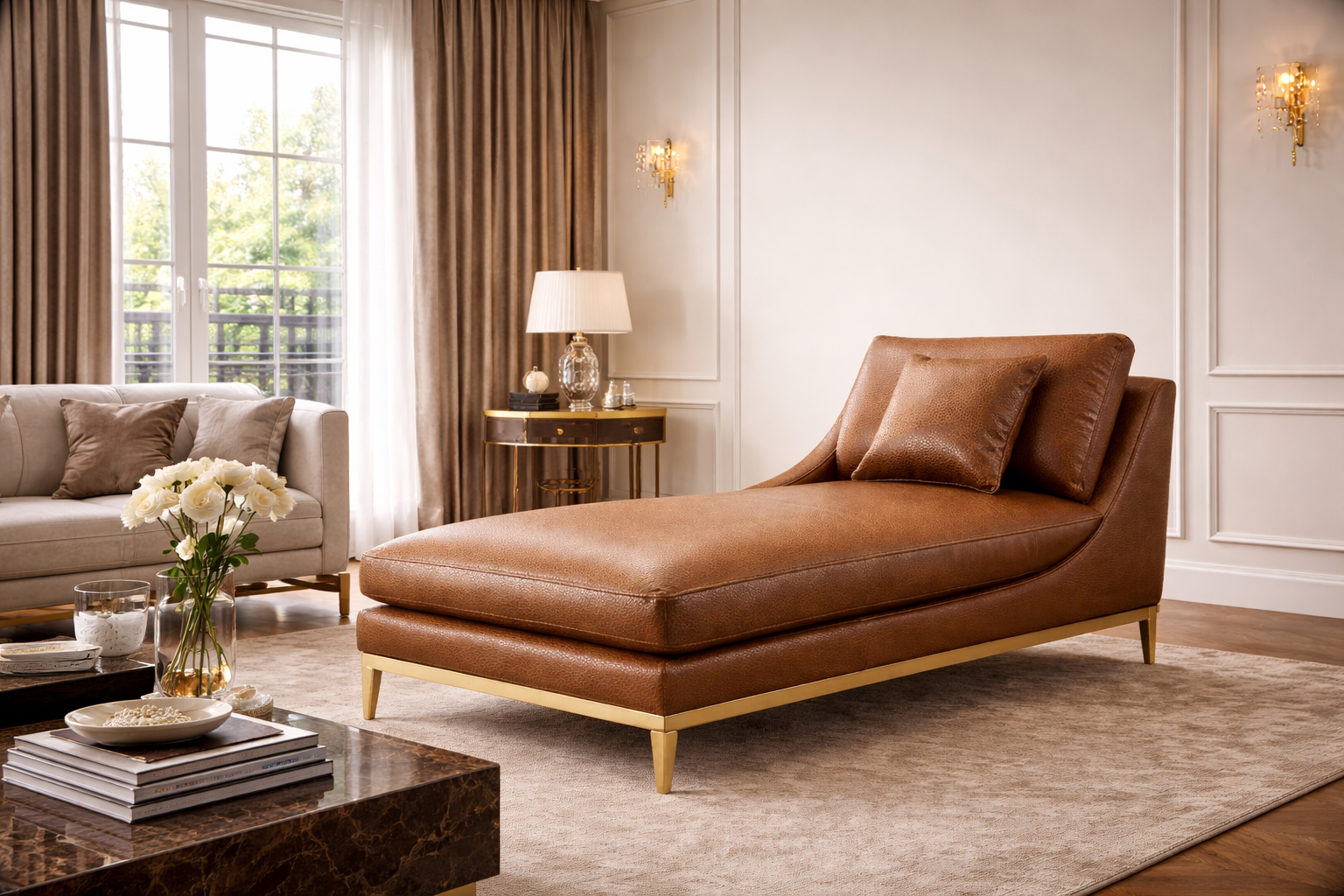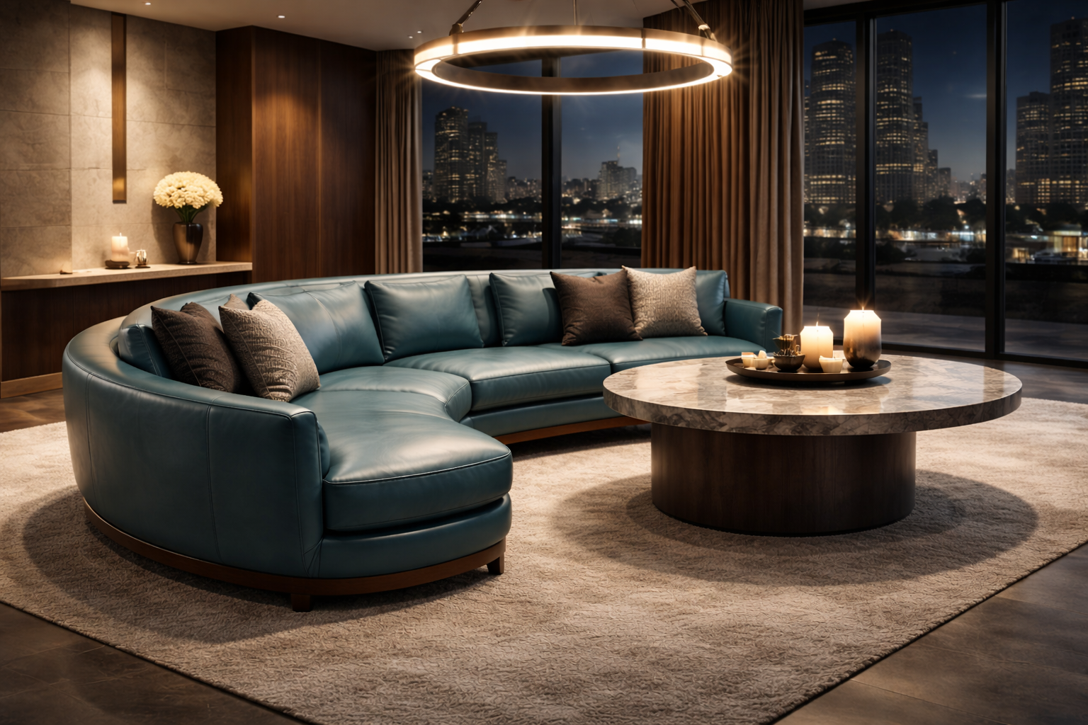 Explore example renderings of leather in use across furniture and interiors. These images are for inspiration only—color and texture may vary by leather line, finish and screen settings. Browse our product lines and color book to find the closest match for your project.